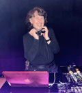 (Foto privat; Bildbeschreibung: vor einer schwarzen Wand steht lächelnd DJ Luise Bass mit einem Kopfhörer. Vor ihr ein aufgeklappter Laptop und daneben ist ein Mischpult zur Hälfte zu erkennen. Sie trägt schwarze Kleidung.)